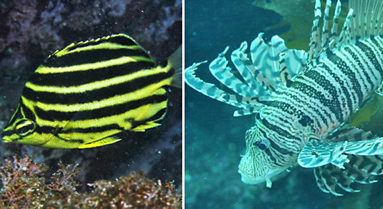 ▲아열대성 어류인 범돔(왼쪽)과 쏠베감펭.