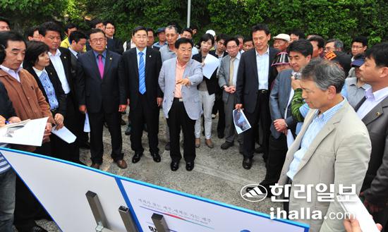 현태근 신설동 대책위원장은 도의원들에게 "행정은 쓰레기매립장의 지목을 1989년 잡종지에서 대지로 변경해 건축허가를 내주고 사후관리도 전혀 하지 않았다"고 성토했다. 현 위원장은 또 "2007년 나리 태풍때 모든 주택이 침수해 지반이 더 약해진 상태라 불안하니 안전하게 이주대책을 세워달라"고 촉구했다.