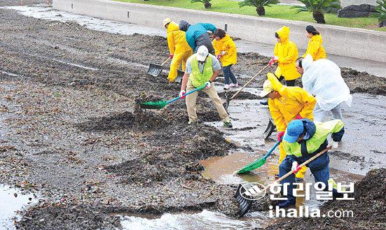 ▲17일 제16호 태풍 '산바'가 제주지방에 직접적인 영향을 주면서 한라산과 중산간 일대에 많은 비를 뿌린 가운데 제주시 병문천에서 유입된 낙엽과 각종 쓰레기가 탑동 인근 도로에 쌓이자 공무원들이 긴급히 수거작업을 벌이고 있다. /사진=강희만기자