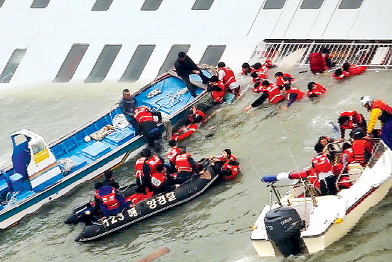▲목포해경 대원들이 16일 오전 전남 진도군 조도면 병풍도 북쪽 20km 해상에서 침몰 직전 세월호 승객 구조에 나서고 있다. 연합뉴스