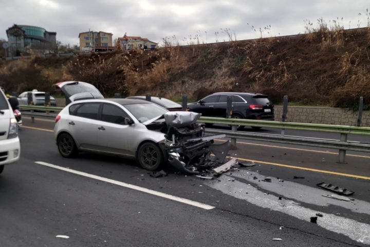 9일 오후 3시 50분쯤 제주시 애월읍 광령리 평화로에서 차량 4대가 부딪히는 사고가 발생했다. 제주소방안전본부 제공