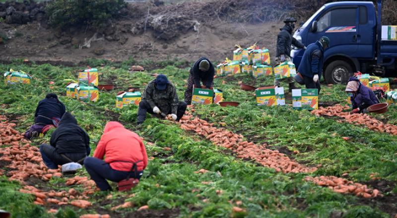 당근 주산지 구좌읍 밭 풍경[한라일보] 21일 제주시 구좌읍 종달리 한 밭에서 농민들이 당근을 수확하고 있다. 강희만기자