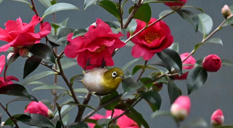 애기동백꽃과 동박새[한라일보] 21일 제주시 노형동 한 아파트 화단에 활짝 핀 애기동백꽃에 동박새 한마리가 날아와 앉아 있다. 강희만기자