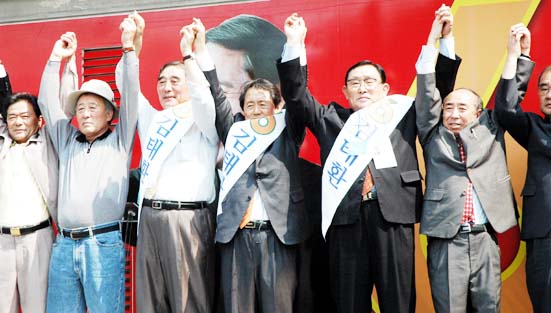 20일 구좌읍 유세장에서 무소속 김태환 제주도지사 후보와 지지자들이 필승을 다짐하고 있다.