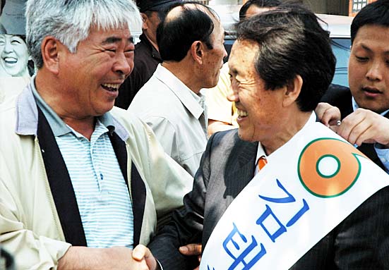 20일 자신의 텃밭과도 같은 구좌읍 거리유세에 나선 무소속 김태환 제주도지사 후보가 유권자들과 악수를 하며 지지를 호소하고 있다.