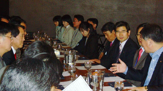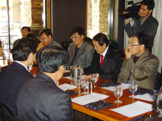 김태환 지사를 비롯해 김재윤.김우남 의원 등 현지 방문단은 FTA 협상 개막일인 4일 낮 한국측 농업분과 협상단 18명과 간담회를 개최, 김종훈 대표 등 농업분과 협상단에게 협상장까지 찾아오게 된 심각한 상황을 설명하고 있다.