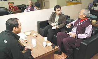 ▲취재팀이 2006년 12월 목포에서 옥매산 광산 조난사고에서 구사일생으로 살아난 김백운씨(오른쪽)를 인터뷰하고 있다. /사진=이승철기자