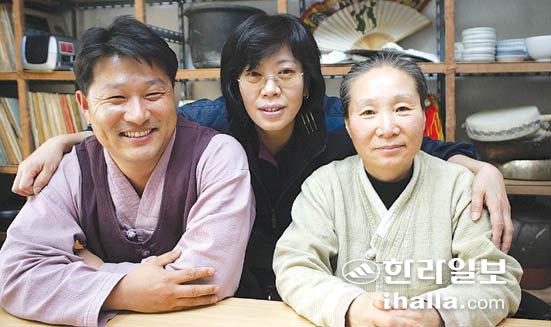 ▲제주신화, 역사 등을 제주어 1인극으로 풀어내고 있는 제주꽃놀래의 안용석·김영숙·오영순씨(왼쪽부터)가 오영순 소장의 살림집에 들어선 연구소 사무실에서 포즈를 취했다. 고경희씨는 다른 곳에 일이 생겨 함께하지 못했다. /사진=김명선기자