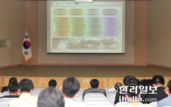 ▲제주특별자치도의 재해·재난에 대비한 유시티시설 안전 대토론회에서 참석자들이 태풍 등 재해에 대한 특징을 도표를 통해 설명을 듣고 있다.