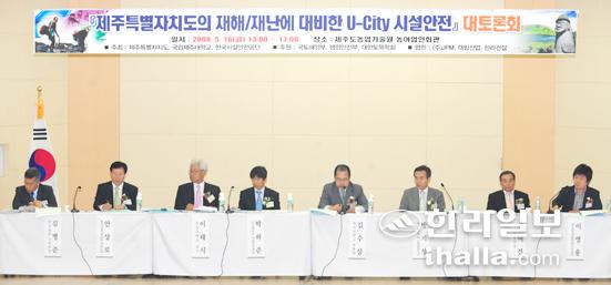 ▲지난 16일 제주도농업기술원에서 열린 제주특별자치도의 재해·재난에 대비한 유시티(U- City)시설 안전 대토론회에서 토론자들은 도심지를 관통하는 하천관리와 하구역·연안역의 해일을 위주로 한 항구적인 종합수해예방대책이 필요하다고 입을 모았다. 사진 왼쪽부터 김병준 한라일보 사회부장, 안상로 한국시설안전공단 연구단장, 이태식 한양대 교수, 서종태 국토해양부 시설안전과 사무관, 김수삼 한양대 부총재, 박일범 행정안전부 안전개선과장, 조여진 JPM회장, 이영웅 제주환경운동연합 사무국장. /사진=이승철기자 sclee@hallailbo.co.kr