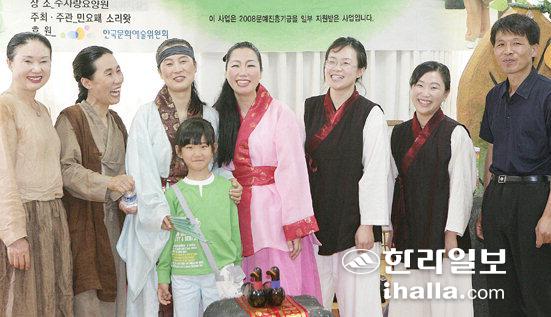 ▲지난 3일 제주시 애월읍 애월리 주사랑요양원에서 '농사의 신 자청비' 공연을 끝낸 민요패 소리왓 단원들이 한자리에 모였다. 왼쪽부터 김항례 현애란 안민희 변향자 허수빈 고희숙 양윤호씨. /사진=김명선기자 mskim@hallailbo.co.kr