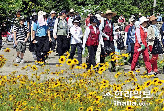 ▲주말인 19일 거문오름 트레킹 현장에는 공무원 노조 등 단체·개별탐방객들의 발길이 이어졌다. /사진=강경민기자 gmkang@hallailbo.co.kr