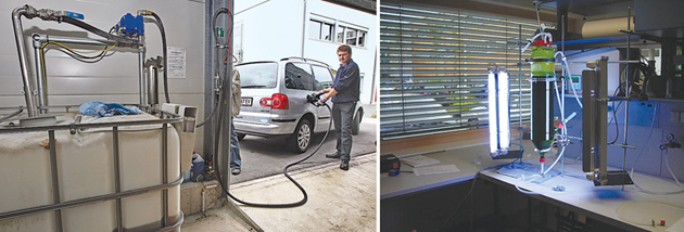 ▲BDI 직원이 회사내에 설치된 주유소에서 바이오디젤을 자신의 승용차에 넣고 있다. 사진 오른쪽은 BDI 실험실에서 해조류 바이오디젤을 연구하는 모습.