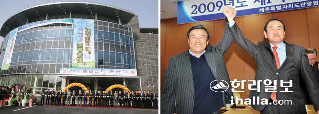 ▲최근 회장선거를 계기로 관광협회의 새 역할모델이 요구되고 있다. 웰컴센터 전경과 선거후 홍명표 회장(오른쪽)이 강중훈 후보와 손을 든 모습. /사진=한라일보DB