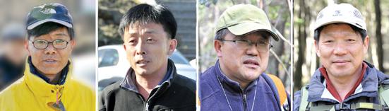 ▲사진 왼쪽부터 탐사대장 오윤호(제주산악연맹 부회장), 숲길조사팀장 현정필(제주산악연맹 이사), 학술조사팀 강만익(인문지리)(세화고 교사), 강영제 연구사(식물)(난대산림연구소)