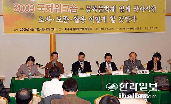 제주특별자치도가 주최하고 (사)제주역사문화진흥원이 주관한 '2009 국제워크숍'이 '등록문화제 일제 군사시설 조사·보존·활용 어떻게 할 것인가'를 주제로 18일 제주칼호텔에서 개최됐다. 제1부 '오키나와 일본군 전적지 현황과 정비·활용사례'와 제2부 '제주도 일본군 전적지-서귀포시권 등록문화재 중심'을 주제로 열린 이번 포럼은 한국과 일본의 전문가들이 참여해 일제가 60여년 전 제주섬에 남긴 군사시설을 조사하고 보존 및 활용하기 위한 방안을 모색하기 위해 마련됐다.