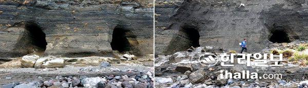 ▲등록문화재로 등록된 송악산 해안 동굴진지(왼쪽)가 퇴적층이 떨어져 내리면서 입구 부분이 무너지고 있는 것으로 나타났다.(오른쪽) /사진=이승철기자