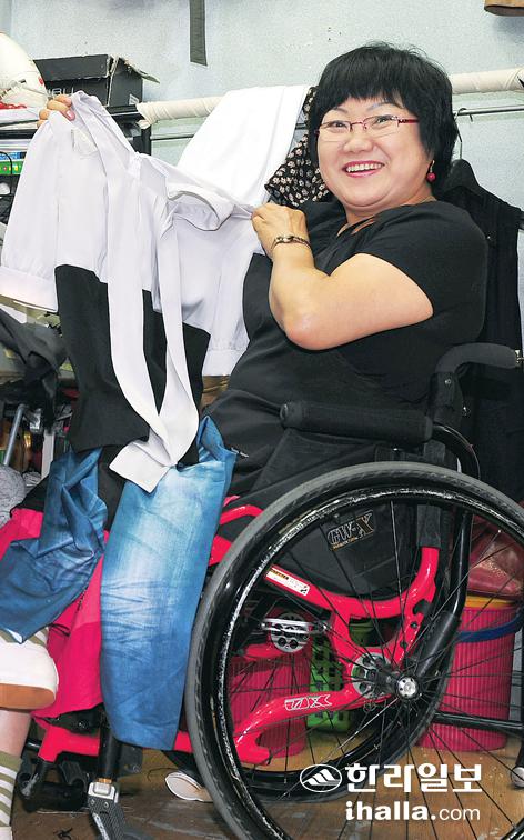 ▲두 다리를 쓰지 못하는 지체장애 1급 양영순씨가 작업대 앞에서 직접 수선한 옷을 내보이며 환하게 웃고 있다. /사진=이승철기자 sclee@hallailbo.co.kr
