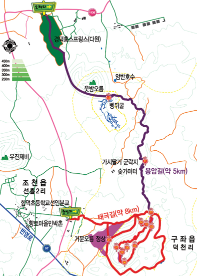< 찾아오시는 길 >< 코스 안내 지도 >▶달라진 탐방로=두 개의 탐방로는 '태극길'와 '용암길'로 이름붙였다.