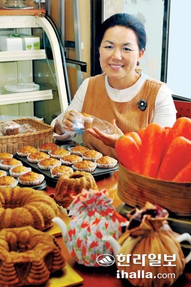 ▲아나운서에서 '당근 케이크 만드는 여자'로 변신해 남편과 함께 제주시 한림읍 귀덕리에 정착한 권혁란씨가 구좌 당근을 재료로 구워낸 빵을 포장하고 있다. /사진=강경민기자 gmkang@hallailbo.co.kr