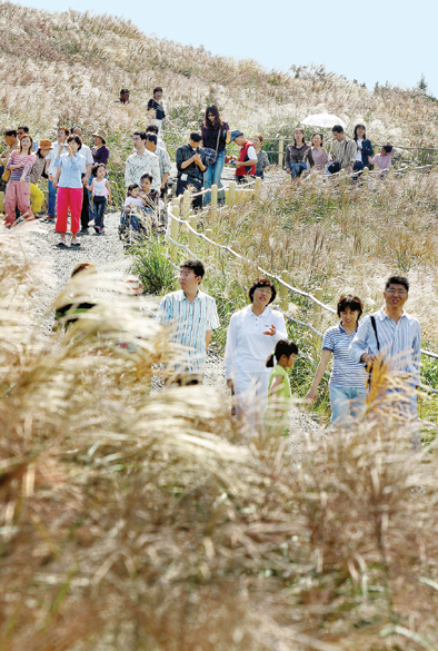 그 억새 사이사이로 산책로가 잘 만들어져 있어 관광객과 도민들이 억새에 파묻혀 걸으며 그 감동을 카메라에 담아내곤 한다.