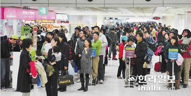 ▲봄철 관광 성수기를 앞둔 가운데 제주노선 항공좌석난이 그 어느 해보다도 극심해질 전망이다. 사진은 여객들로 붐빈 제주국제공항 대합실 전경. /사진=이승철기자