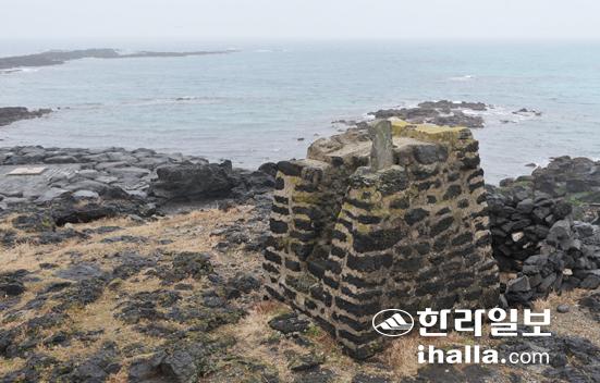 ▲제주시 조천읍 북촌 포구의 등명대는 1915년 12월 축조된 등대로 일각에서는 이를 제주도 최초의 민간등대로 꼽는다. 상단에 '등명대'란 글자가 박힌 빗돌이 세워져 있다. /사진=강희만기자 hmkang@hallailbo.co.kr