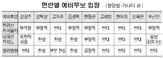 그러나 도지사 예비후보들은 내국인카지노와 영리병원 도입 등의 핵심현안에 대해선 9명의 후보중 찬성·반대입장이 팽팽하게 둘로 나뉘는 극명한 입장차를 보이면서 향후 해당 현안추진에 어려움을 예고했다.