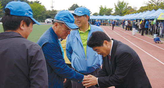 ▲강상주 무소속 제주도지사 후보는 지난 16일 일고인 체육대회에 참석, 지지를 호소했다. 강 후보는 17일 외부활동 대신에 TV토론 등에 전념했다.