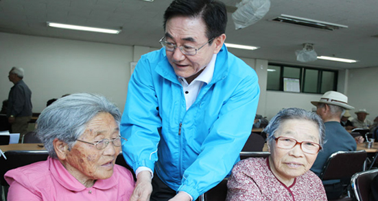 ▲현명관 무소속 제주도지사 후보가 17일 노인회제주시지회 회원들을 만나 지지를 호소하고 있다.