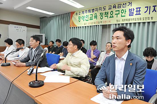 3개 장애인단체 관계자들이 20일 제주도의회 도민의 방에서 기자회견을 갖고 지방선거 제주도교육감 후보들에게 제주 장애인 정책 요구안을 제안하고 있다./사진=강희만기자