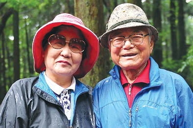 '제주 산악 역사의 산증인'인 안흥찬(81)·김정희(77)씨 부부가 제2회 사려니 숲길걷기 개막일인 12일 비자림로 인근의 사려니 숲길을 찾았다. <사진>