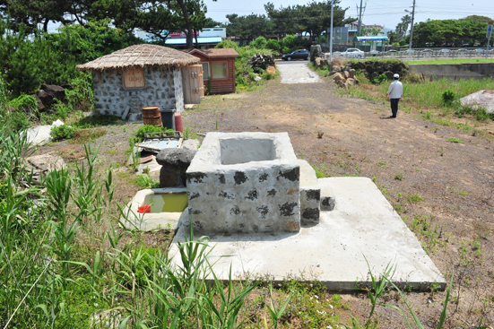 ▲서귀포시 대정읍 동일1리에 복원된 '날외소금밭'. 마을 노인회에서 옛 기억을 되살리며 만들어 놓은 소금막과 물통 등이 눈에 들어온다. /사진=이승철기자