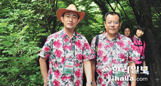 중국 산둥성에 있는 태산풍경명승구관리위원회 리우 시아양 부주임과 미아오 칭 마케팅과장이 10일 제주시 조천읍 선흘2리에서 열린 2010 세계자연유산 거문오름 국제트레킹 개막식을 찾았다.