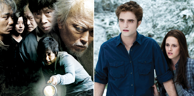▲이번주 극장가는 한국영화와, 뱀파이어의 사랑을 주제로 한 할리우드 영화의 경쟁이 뜨겁다. 강우석 감독의 '이끼'(왼쪽)는 인터넷을 뜨겁게 달군 웹툰 '이끼'가 원작으로, 본격 서스펜스 드라마를 표방하고 있다. 데이비드 슬레이드 감독의 '이클립스'는 동명 판타지 소설을 원작으로 한 작품으로, 10대 소녀 팬들을 타깃으로 한 '트와일라잇' 시리즈 세 번째 작품이다.