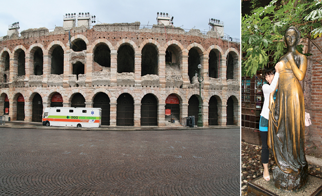 ▲문학과 오페라의 도시 베로나는 전통에만 집착하지 않고 새로운 트렌드를 받아들이고 접목시킨 뒤 수백만명의 관광객을 불러들이고 있다. 로마시대 격투장(사진 왼쪽)을 오페라 극장으로 탈바꿈시키고 로미오와 줄리엣(사진 오른쪽)의 소설 속 이야기를 물질화시켜 관광지로 승화시켰다. /사진=공동취재단