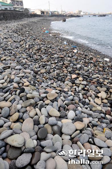 ▲1999년부터 시작된 방파제 공사로 인해 하나로 이어졌던 알작지 해안이 나눠졌고 조약돌들도 대규모로 유실되고 있다. /사진=강희만기자