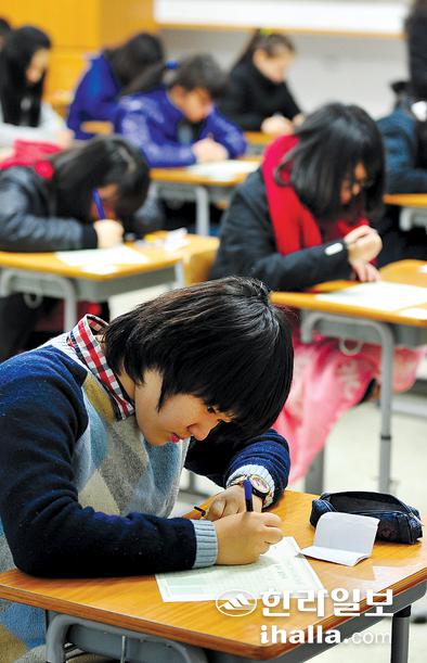 ▲지난해 12월 치러진 2011학년도 고입선발시험. 제주시 평준화지역 일반계고 진학을 목표로 둔 중3 학생들이 응시했다.