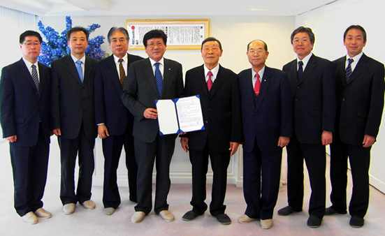 ▲재일동포 김창인 회장(왼쪽에서 다섯번째)이 일본을 방문한 허향진 제주대학교 총장에게 문화교류관 공사비로 6억여원을 또 쾌척했다. /사진=제주대학교 제공