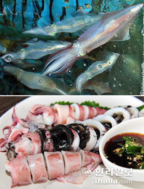 ▲물회 재료인 한치가 수족관에 들어찼다(사진 위). 한치를 통째로 삶아낸 먹통한치(가운데)