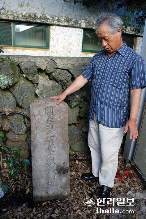 왼쪽은 영천초의 탄생 배경이 된 법호촌의 유래를 말해주는 기념비. 현재 서귀포온성학교와 이웃한 시온교회에 놓여있다. /사진=진선희기자