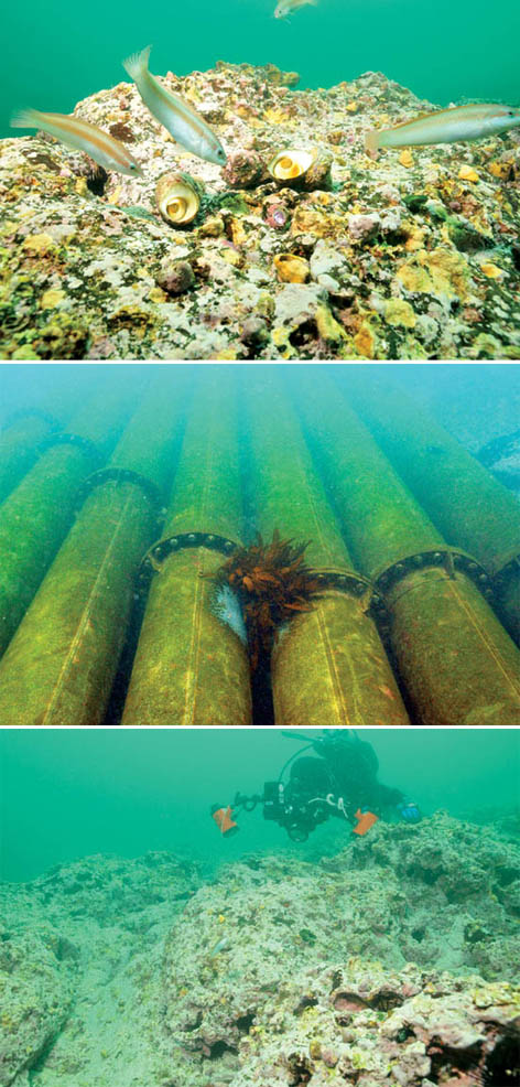 ▲신천리 마을어장은 갯녹음 현상으로 일반 해조류는 거의 찾아볼 수 없었다. 사진 위부터 해조류가 없는 수심 5m에 서식하는 소라의 모습, 10m에 있는 양식장 배관, 갯녹음이 진행된 수심 15m의 암반 지역.