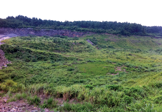 ▲곶자왈 지역 채석장 개발 후 복구한 모습. 깊게 파여진 지형을 그대로 놔둔 채 어린 나무를 심어 놓았다.