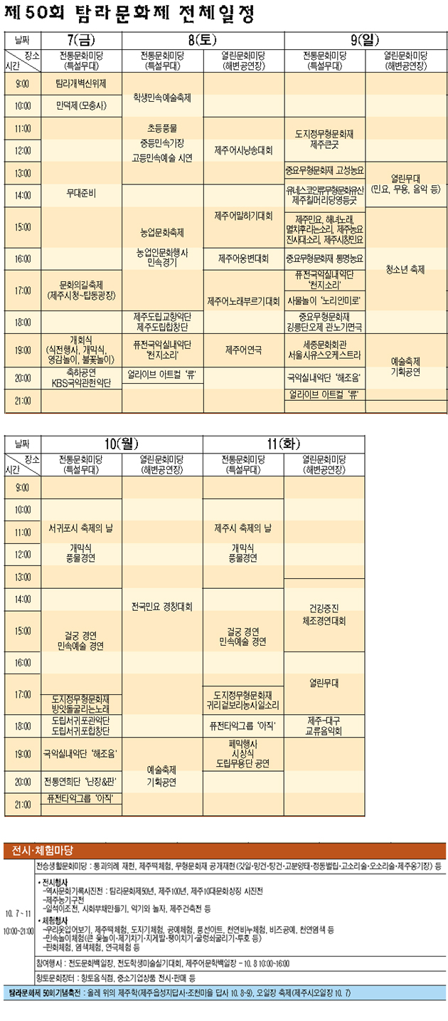 '천년의 탐라문화! 세계문화유산으로'를 주제로 내건 제50회 탐라문화제가 오는 7일부터 11일까지 제주시 탑동광장 일대에서 펼쳐진다. 한국예총제주특별자치도연합회가 주최하고 제주특별자치도가 후원하는 올해 탐라문화제는 새로운 도약의 원년으로 삼고자 대제전으로 대폭 개편해 운영한다.