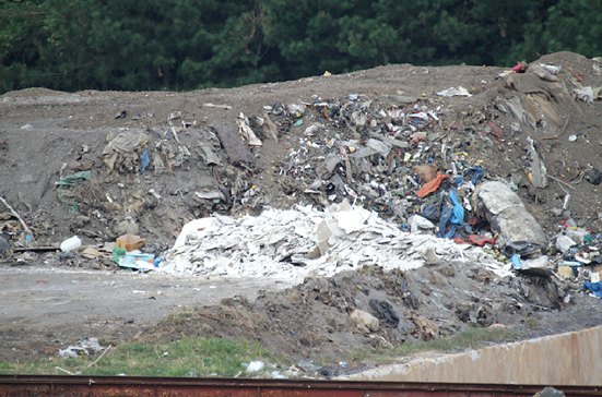▲만인보 기행에서 발견한 폐기물 매립 장면. 천장용으로 썼던 석면이 매립되는 것으로 보인다. 곶자왈 지역의 채석장중에는 이처럼 채석이 끝난 후 건축폐기물 매립장으로 둔갑하는 일이 있다.