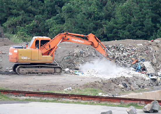 ▲곶자왈 채석장에 폐기물을 버리고 난 후 황급히 포클레인으로 마무리하고 있다.
