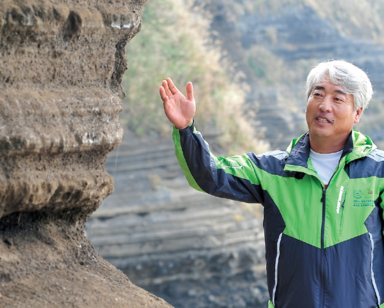 ▲세계지질공원 수월봉 국제트레일이 열리고 있는 한경면 고산1리의 고광훈 이장은 "마을주민들의 삶이 고스란히 녹아있는 아름답고 소중한 수월봉 지질공원을 지역주민과 더불어 숨쉬는 제주의 보물로 차근차근 가꿔나가는 게 바람"이라고 전했다.