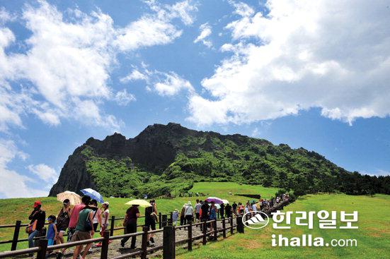 ▲세계자연유산지구로 등재된 지역의 발전을 위해서는 주민들을 위한 지원이 강화되어야 한다는 지적이다. 성산일출봉을 찾은 탐방객들. /사진=한라일보 DB