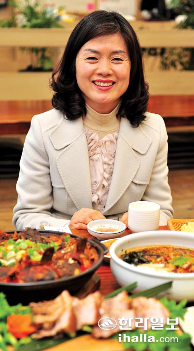 ▲제주시 노형동에 위치한 '청어림'은 농장에서 무농약으로 직접 재배한 친환경 채소와 콩으로 음식을 만들어 선보이며 타 식당과 차별화를 두고 있다. 청어림의 신영숙 대표가 넉넉하게 차려진 상 앞에서 웃고 있다. /사진=강경민기자