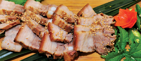 이 쯤 되면 살아있는 생선과 무농약 야채로 만든다는 음식맛이 더 궁금해진다. 신 대표가 자신있게 추천한 음식은 삶은 돼지고기를 도마위에 얹어내는 '돔배고기'다. 제주산 오겹살을 쓰는 돔배고기는 레몬·양파·생강·구아바잎·대파를 함께 넣어 40분정도를 삶으면 옅은 갈색빛의 먹음직스런 수육이 완성된다. 도톰하게 썰어낸 돼지고기를 도마 위에 얹어내는 과정을 지켜보자니 얼른 한 점 집어먹고 싶은 유혹에 침이 '꼴깍' 넘어간다. 돔배고기는 잘 익은 김치에 한 입 싸먹어야 역시 제맛이다. 중간크기가 3만원, 큰 것은 4만원이다.